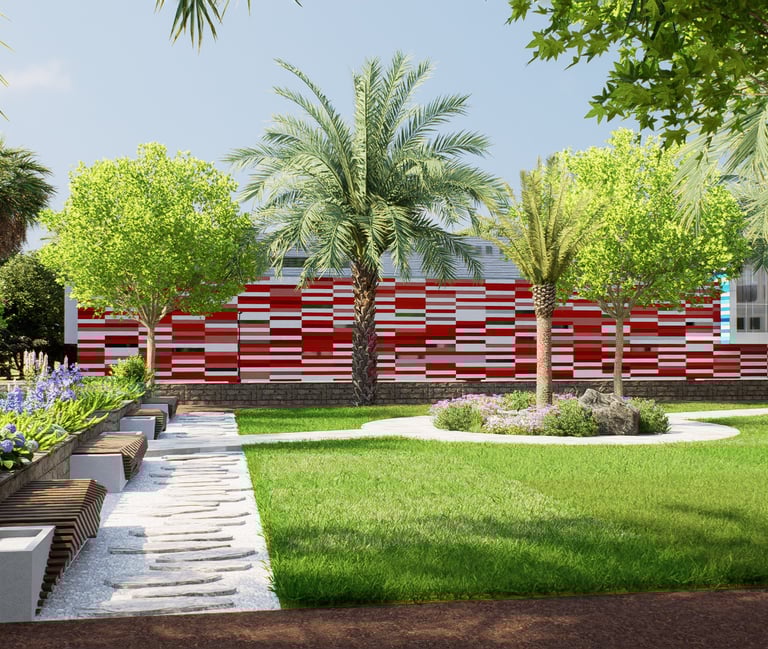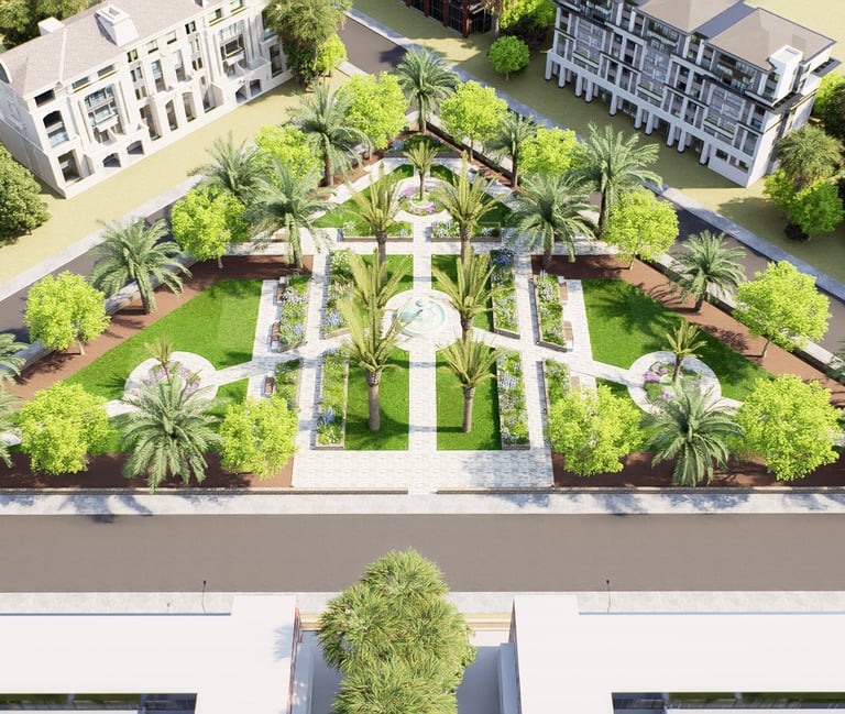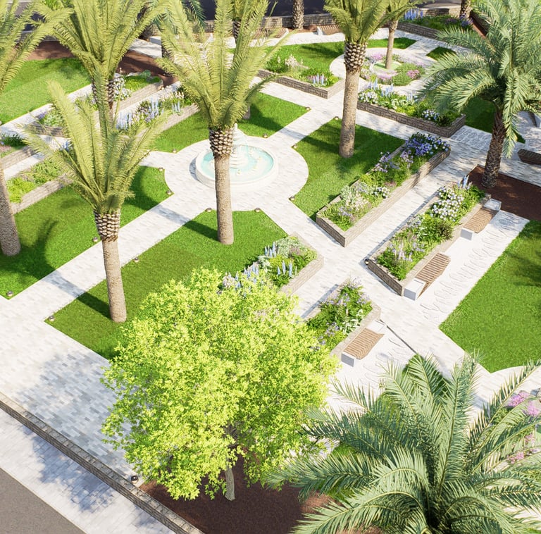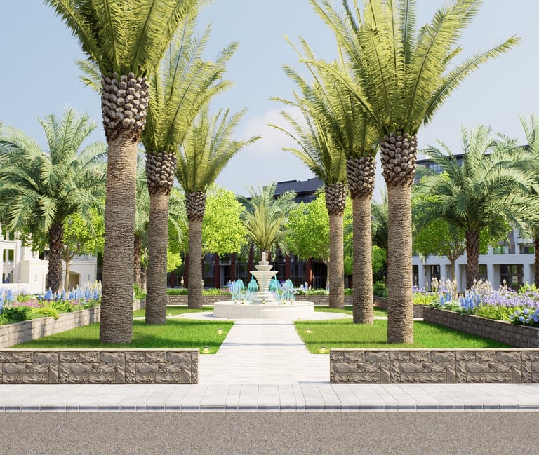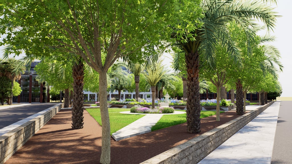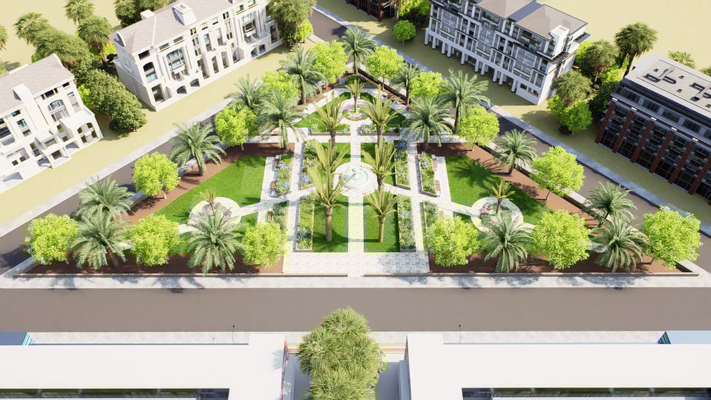 يشمل المشروع التصميم الهندسي الكامل والتنفيذ المستمر للأعمال الخارجية عبر عدة مناطق، مطورة على مراحل متتابعة.